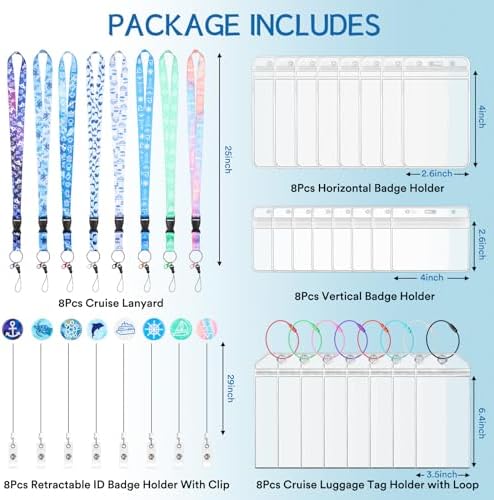 8 x Cruise lanyard8 x Vertical card holder8 x Horizontal card holder8 x Cruise luggage tag holder with stainless steel loop8 x Retractable badge reel