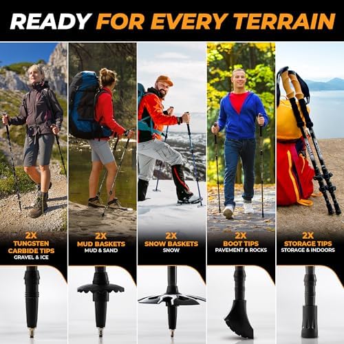 SUITABLE FOR ALL TERRAINS. Whether ice climbing or on a casual stroll, our trekking poles include durable accessories and tungsten carbide tips for any terrain. Carrying case and clip are included for easy transportation and storage.