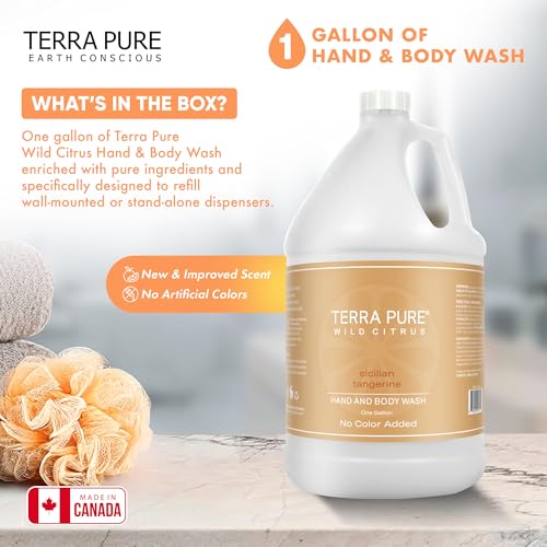 IMPROVED SCENT, SAME TRUSTED QUALITY: Experience the enhanced Terra Pure Wild Citrus Sicilian Tangerine formula—PROUDLY MADE IN CANADA with no added color, an upgraded scent, and enriched with nourishing aloe, raw honey, and olive oil. This luxurious gallon hand and body wash provides a smooth lather that’s gentle on skin and perfect for sensitive users. Designed for use in wall-mounted or stand-alone dispensers at hotels, Airbnbs, guest bathrooms, spas, gyms, and home settings.