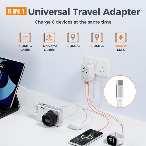 6 in 1 Universal Adapter for Travel: Power adapters for international travel has 1 AC Outlets, 1 USB C cable and 4 USB (2 USB C), charging 6 devices simultaneously; The universal socket converts plugs of US, EU, UK, AU