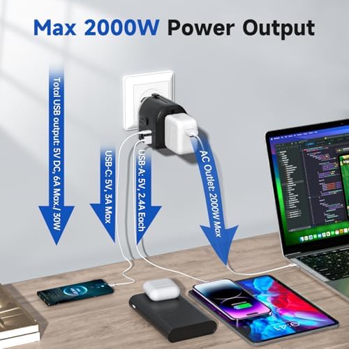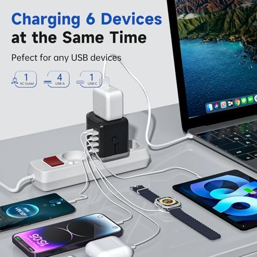 6-in-1 International Power Adapter: The power adapter offers a AC power socket and 5 USB charging ports, with a maximum capacity of up to 1840W (250V, 8A MAX), allowing you to charge up to 6 devices simultaneously. It’s suitable for hotels, bedrooms, and college dormitories.